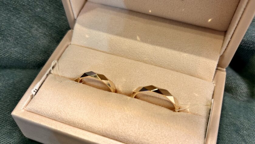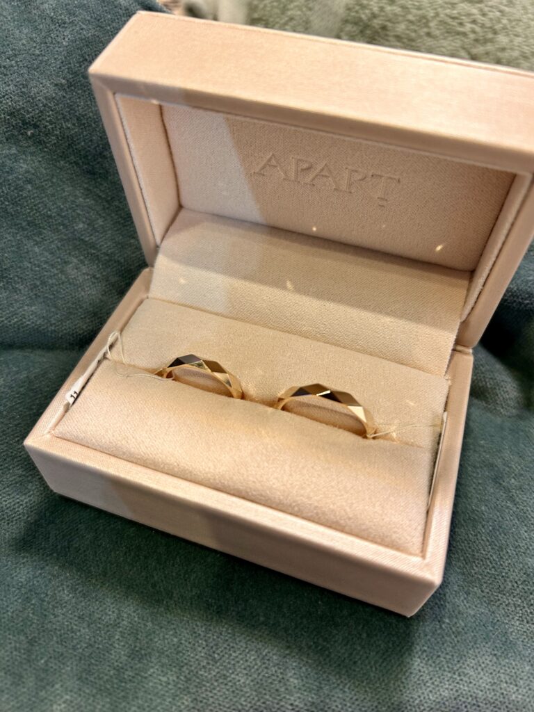 Nie chciałam żadnym wymyślnych obrączek, a już z pewnością nie grubych, takie 2-3 mm będą idealne. Bez wzorów, żadne dwu kolorowe, żadne z brylantem. Proste delikatne obrączki i tak z głupia patrzyłam a Aparcie, mi się spodobały 3 wzory, jeden zupełnie prosty, jeden konstruktywistyczny i jeden z południowymi wzorami- ja to tak kojarzę. Ale Tomek bezapelacyjnie zdecydował się na jedne, poszliśmy do salonu je obejrzeć i dobrać rozmiar i zamówiłam je w internecie. Hmmm… czas oczekiwania był 28 dni, a my dostaliśmy je po tygodniu więc takie wielkie pozytywne WOW!
