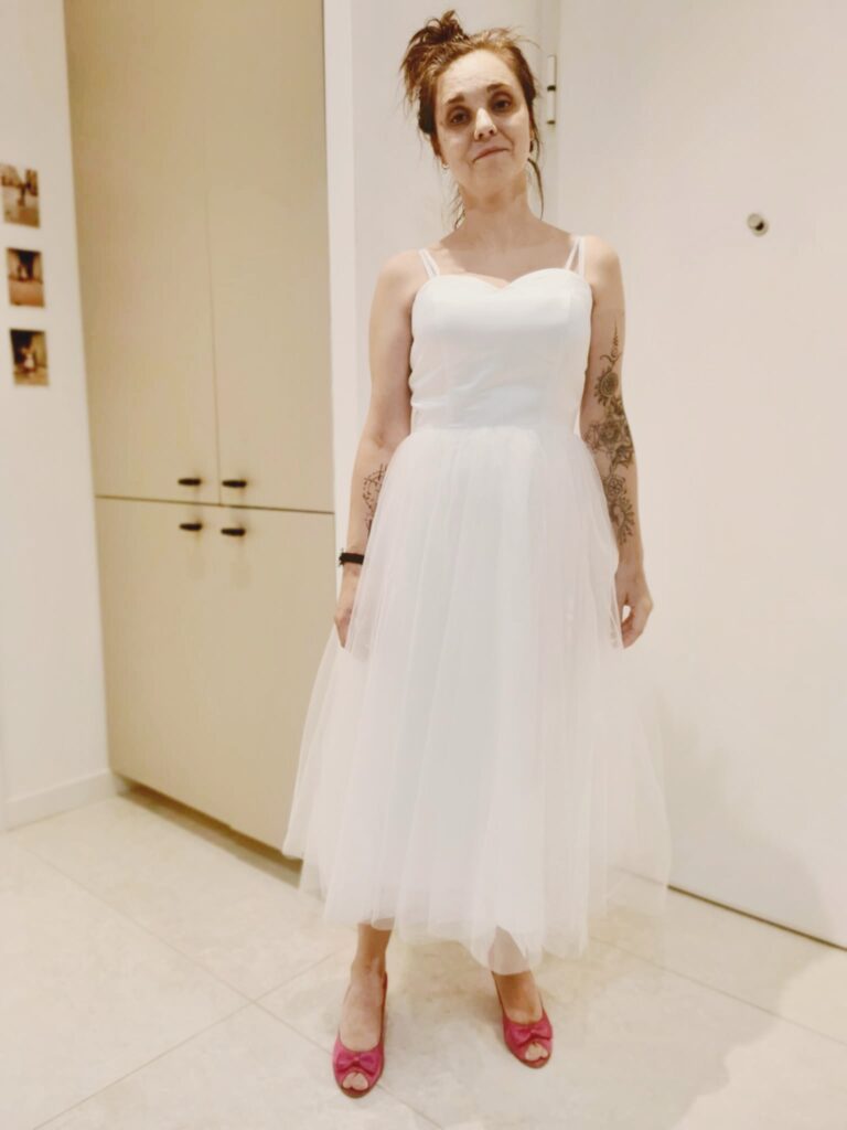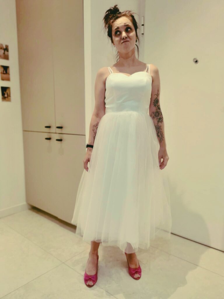 Kolejne dni, bo tak szczerze mówiąc jest sobota i dopiero się odzywam.. w czwartek nawet nie dałam rady iść na zabieg TMS, stres rano pojawił się niezwykle silny, nie podoba mi się taki początek dnia. Później wezwaliśmy lekarza bo nadal fatalnie się czułam, ale jedyne co nam powiedział to to, że trzeba jechać na Sor! Ja sięgając do szafki po szklankę straciłam przytomność, ale nie miałam zamiaru spędzać całej nocy na Sorze, postanowiłam poczekać na kolejny dzień… a i oczywiście miałam przeciekawe ciśnienie bo około 85/45. Z czwartku na piątek i początek piątku zaczęłam od Diazepamu i dobrze zrobiłam, bo ustalając sobie jakąś kolejność leków o różnych porach nocy i poranka sprawiło, że rano czułam się jedynie źle, a nie- jakbym miała umrzeć! Natomiast w piątek do wieczora byłam słabiutka, ale wyprowadziłam się ze stresu właśnie Diazepamem (niewielka ilość wystarczyła), zrozumiałam, że to wszystko, całe objawy – to stres!!! W piątek wieczór trochę się pozbierałam i nawet poczułam lepiej, nawet zmierzyłam zamówione sukienki, wyszłam jak śmierć, ale zdjęcia są i nawet na nich ustałam: