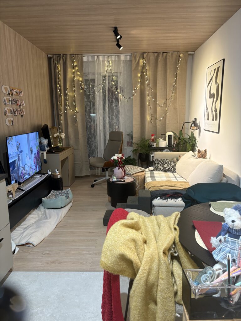 Koło 16:30 byliśmy już w mieszkaniu. Wszystko powoli nabiera tam kształtu — ściany oddychają nowością, a każde światło, które włączam, daje nadzieję, że niedługo to miejsce naprawdę ożyje. Wróciliśmy do domu, a tam jak zwykle: zakupy, rozpakowywanie, psy, ogarnianie, życie. Kupiliśmy lampki choinkowe, tylko… nie mamy choinki. Cóż, przy naszym metrażu choinka chyba by się obraziła. Więc zawisły na oknie. I w sumie wygląda to całkiem magicznie.